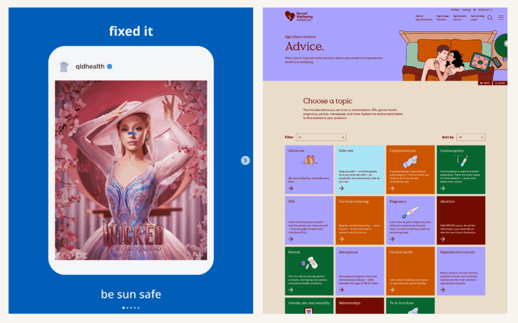 Some healthcare providers are already doing this well. Take Sexual Wellbeing Aotearoa’s comprehensive advice hub on sexual and reproductive health, which answers FAQs on everything from contraception to reproductive cancers. Queensland Health has become famous for its social media campaigns, raising awareness of common conditions through cheeky memes accompanied by long-form posts.